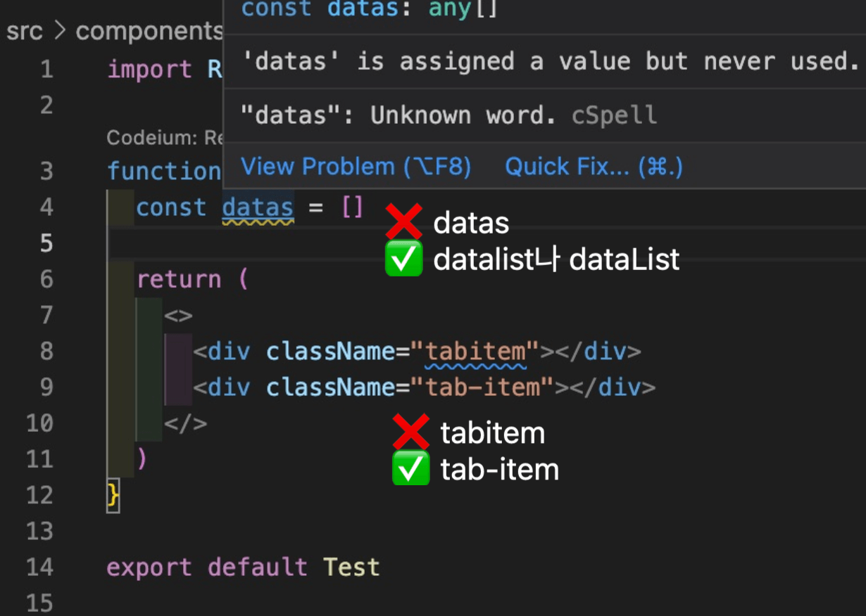 .tabitem처럼 단어가 붙어 있으면 .tab-item으로 수정하라고 알려줍니다.